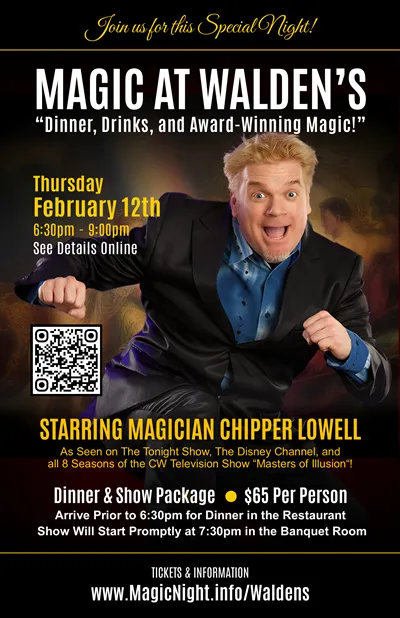 After dining on a set menu in the restaurant (3 options), join us in the banquet room after dinner for drinks and an incredible "Evening of Magic" with an ever-changing series of magicians from around the country!